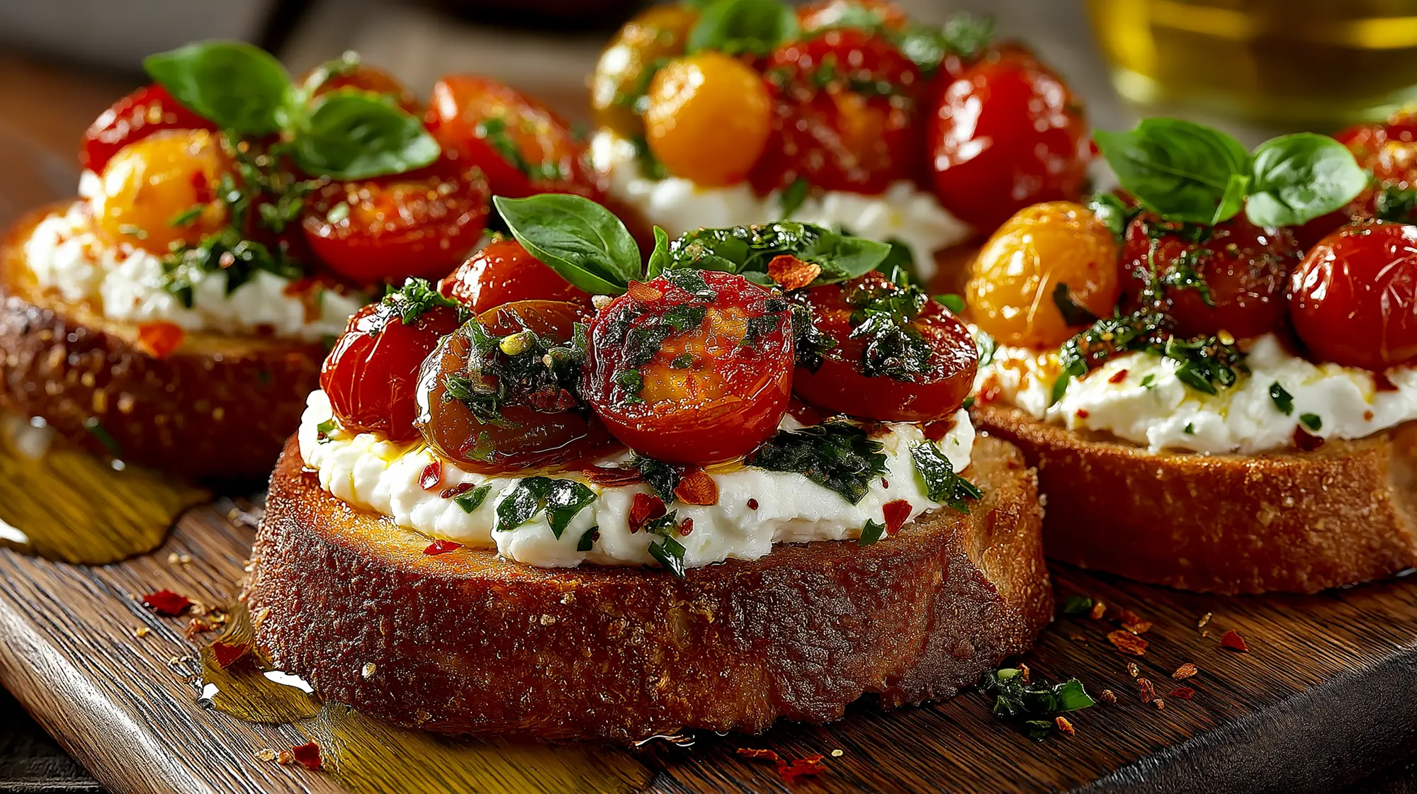 Die Brotscheiben halbieren, mit der Ricottacreme bestreichen und die Tomaten darübergeben. Ein paar Chiliflocken und kleine Basilikumblätter darauf streuen.
