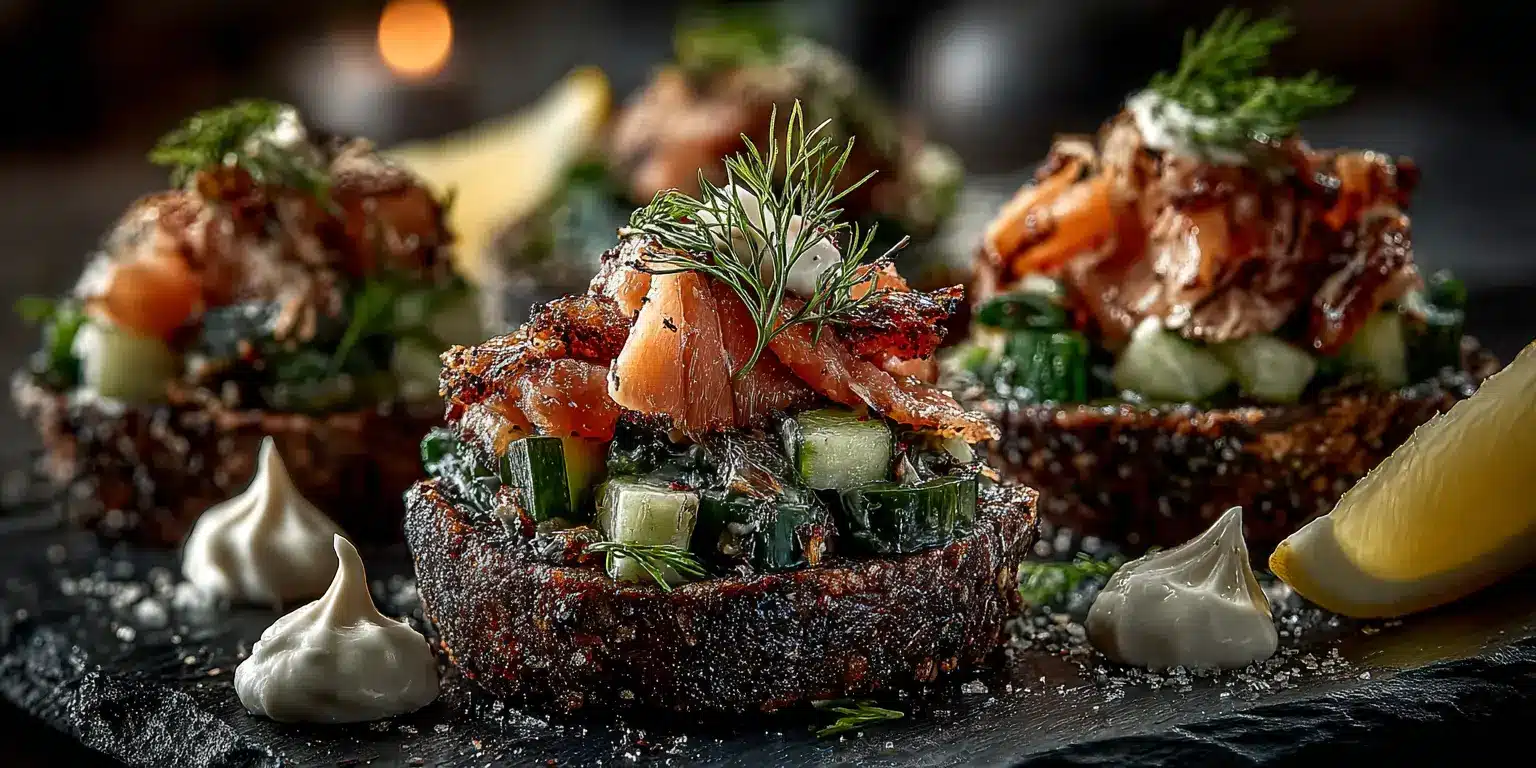 Nordische Eleganz in Perfektion. Das fein gewürzte Forellentartar mit frischem Dill und Meerrettich auf dunklem Pumpernickel verkörpert die Essenz der gehobenen skandinavischen Küche. Ein Fingerfood für Kenner, das durch seine Frische und Raffinesse besticht.