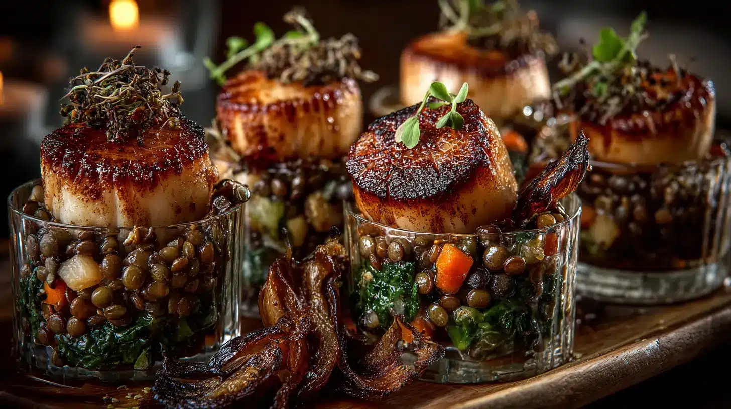 Haute Cuisine im Miniaturformat. Die perfekt gebratenen Jakobsmuscheln auf einem warmen Linsensalat mit Haselnussöl verkörpern pure Eleganz. Ein Fingerfood für besondere Anlässe, das durch seine Raffinesse und den Kontrast von Texturen begeistert.