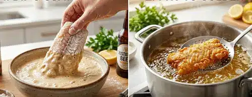 TIP: Der Teig sollte nicht zu fest werden, weil sonst beim frittieren eine zu dicke Panade entsteht! Vorsichtig und mit wenig Bier den Teig noch einmal aufrühren.