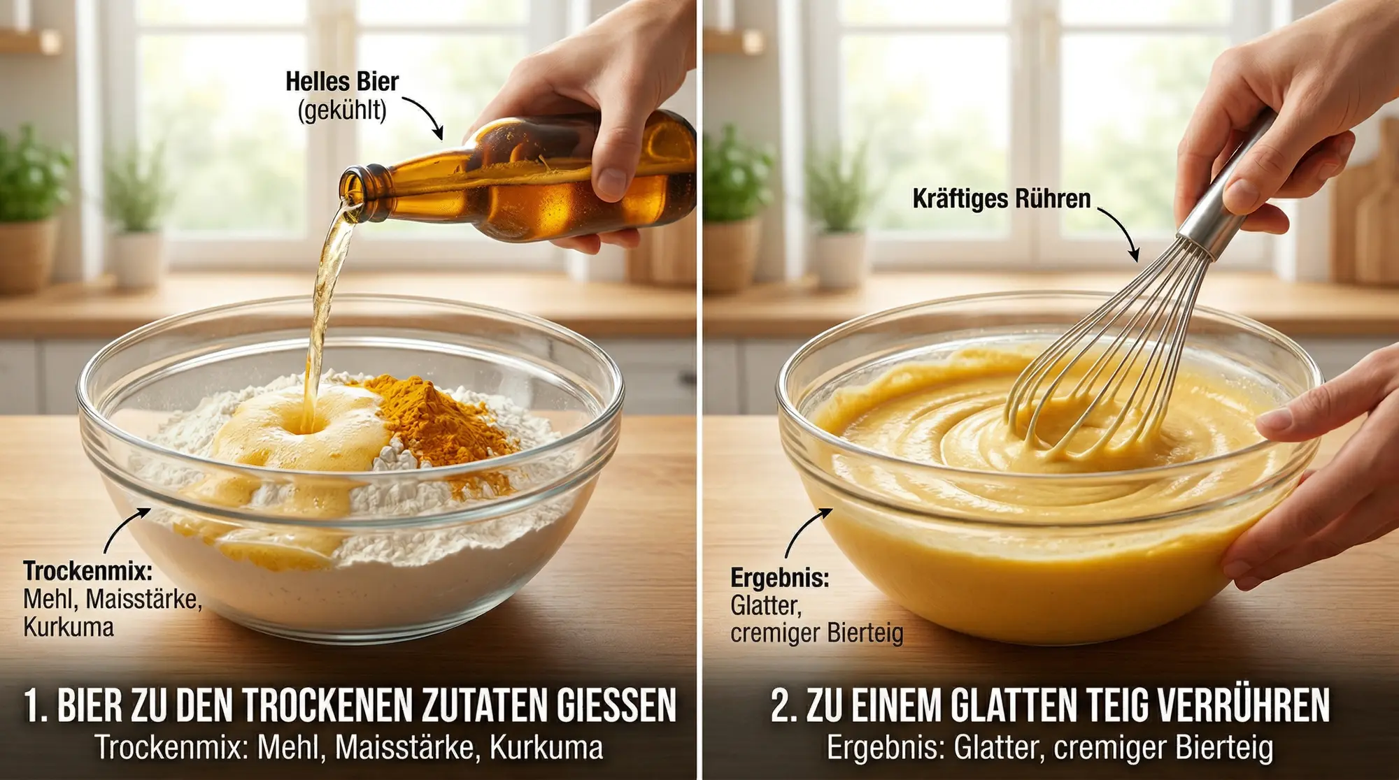 Zutaten: 150 g Mehl / 50 g Maisstärke / 250 ml helles Bier (alternativ Wasser mit Kohlensäure) / 1 TL Kurkuma