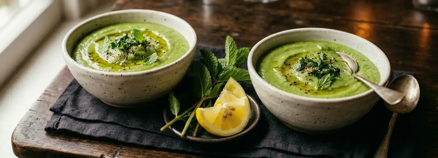 Ca. 100 g Butter in einem Topf erhitzen und die Erbsen kurz darin andünsten und mit einem Stabmixer grob mixen.