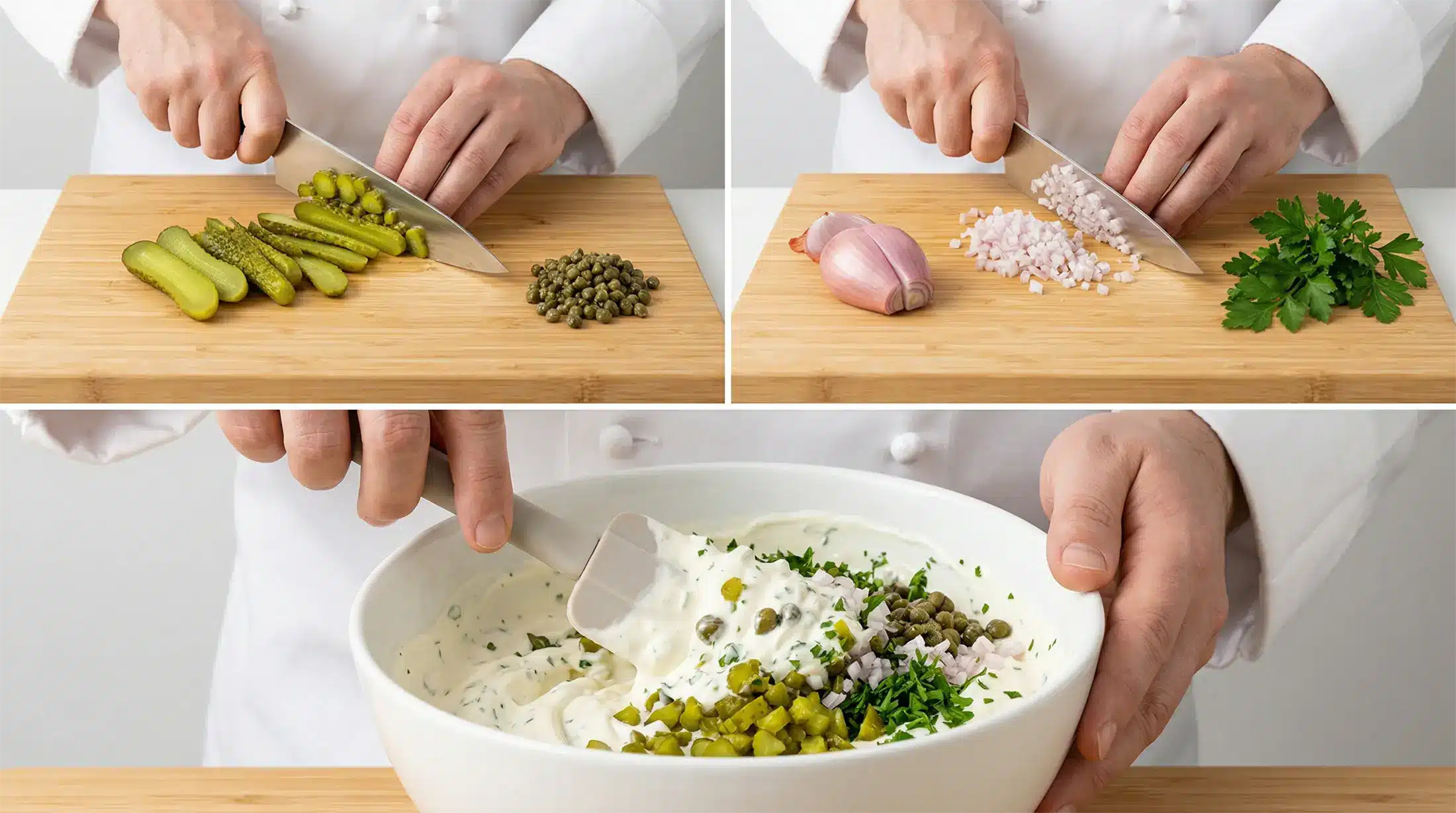 Schalotten abziehen und in feine Würfel schneiden sowie die Petersilie waschen und fein hacken.