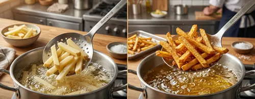 Dann gibt man sie ein zweites Mal in das Frittieröl und läßt Sie noch einmal für 2 bis 3 Minuten ausbacken!