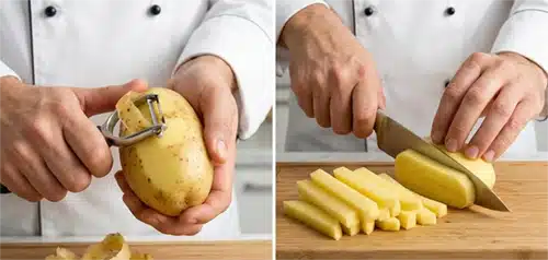 Die Kartoffeln schälen, in ca. 8 Millimeter dicke Scheiben und dann in lange Stifte schneiden.