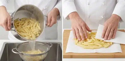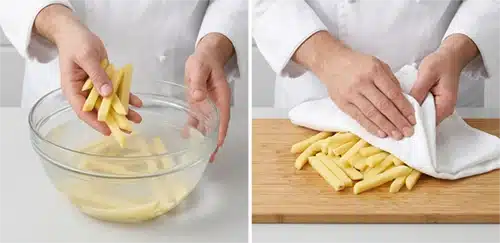 Anschließend die Kartoffelstifte für ca. 5 Minuten in kaltem Wasser einweichen, dann waschen und abtrocknen lassen.