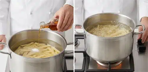 In einem großen Topf den Malzessig und Salz geben, kaltes Wasser hinzufügen und die Pommes einmal aufkochen und dann mit reduzierter Hitze etwa 12 Minuten leicht köcheln lassen, bis sie gar sind.